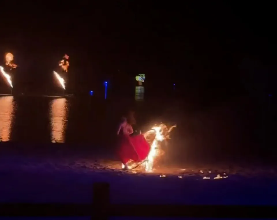 Një balerinë u përfshi nga flakët dhe vrapoi frikshëm drejt një lumi ndërsa performonte një spektakël të rrezikshëm në Kinë.