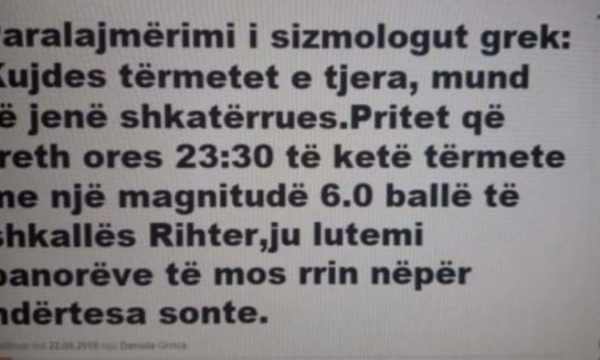 Në lajmin e tyre citohej sizmologu i njohur grek, Akis Tselentis dhe shkruhej se një tërmet 6 ballë do të binte në Shqipëri në orën 23:30.