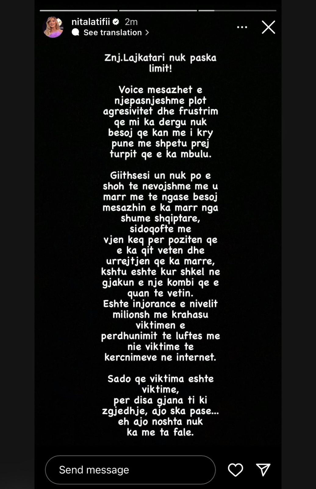 “Zni.Lajkatari nuk paska limit! Voice mesazhet e njëpasnjëshme plot agresivitet dhe frustrim që m’i ka dërguar nuk besoj që kanë me i kry punë me shpëtu prej turpit që e ka mbuluar.