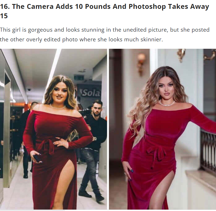 ‘’Kjo vajzë është e mrekullueshme dhe duket mahnitëse në foton e pa edituar, por ajo postoi foton tjetër tepër të edituar ku duket shumë më e dobët. Kamera shton 10 kile dhe Photoshop largon 15’’, thuhet në mbishkrimin e lënë sipër fotove të Encës.