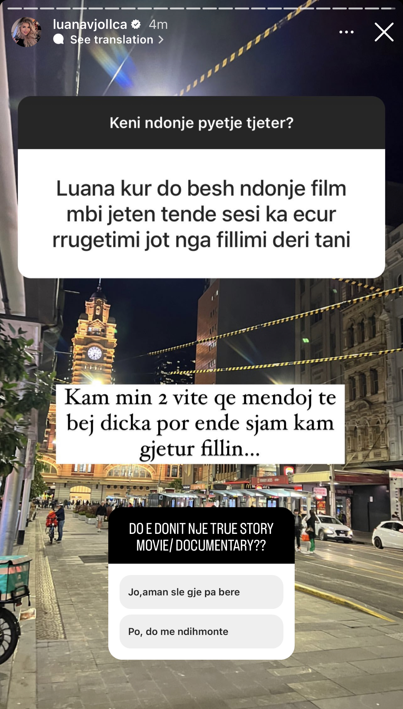 Ajo u pyet nga njëri prej tyre se kur do bëjë një film për jetën e saj dhe mënyrën sesi i ka ecur karriera. Po mesa duket Luana është shumë hapa para. Ajo ka zbuluar se këtë e ka menduar para dy vitesh, por ende nuk ia ka nisur punës