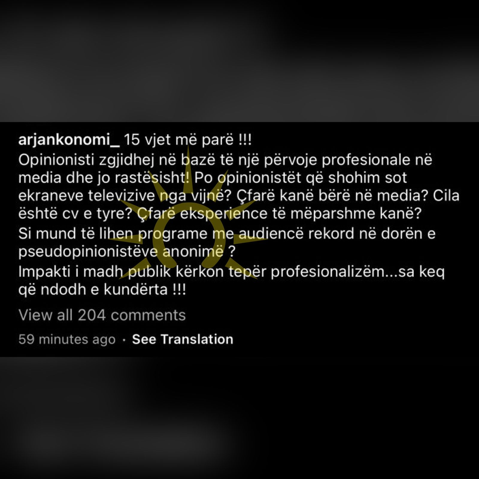 “15 vite më parë. Opinionisti zgjidhej në bazë të një përvojë profesionale në media dhe jo rastësisht. Po opinionistët që shohim sot ekraneve televizive nga vijnë? Çfarë kanë bërë në media? Cila është CV e tyre? Çfarë eksperience të mëparshme kanë? Si mund të lihen programe me audiencë rekord në dorën e pseudo-opinionistëve anonimë? Impakti i madh publik kërkon tepër profesionalizëm…sa keq që ndodh e kundërta!!!”