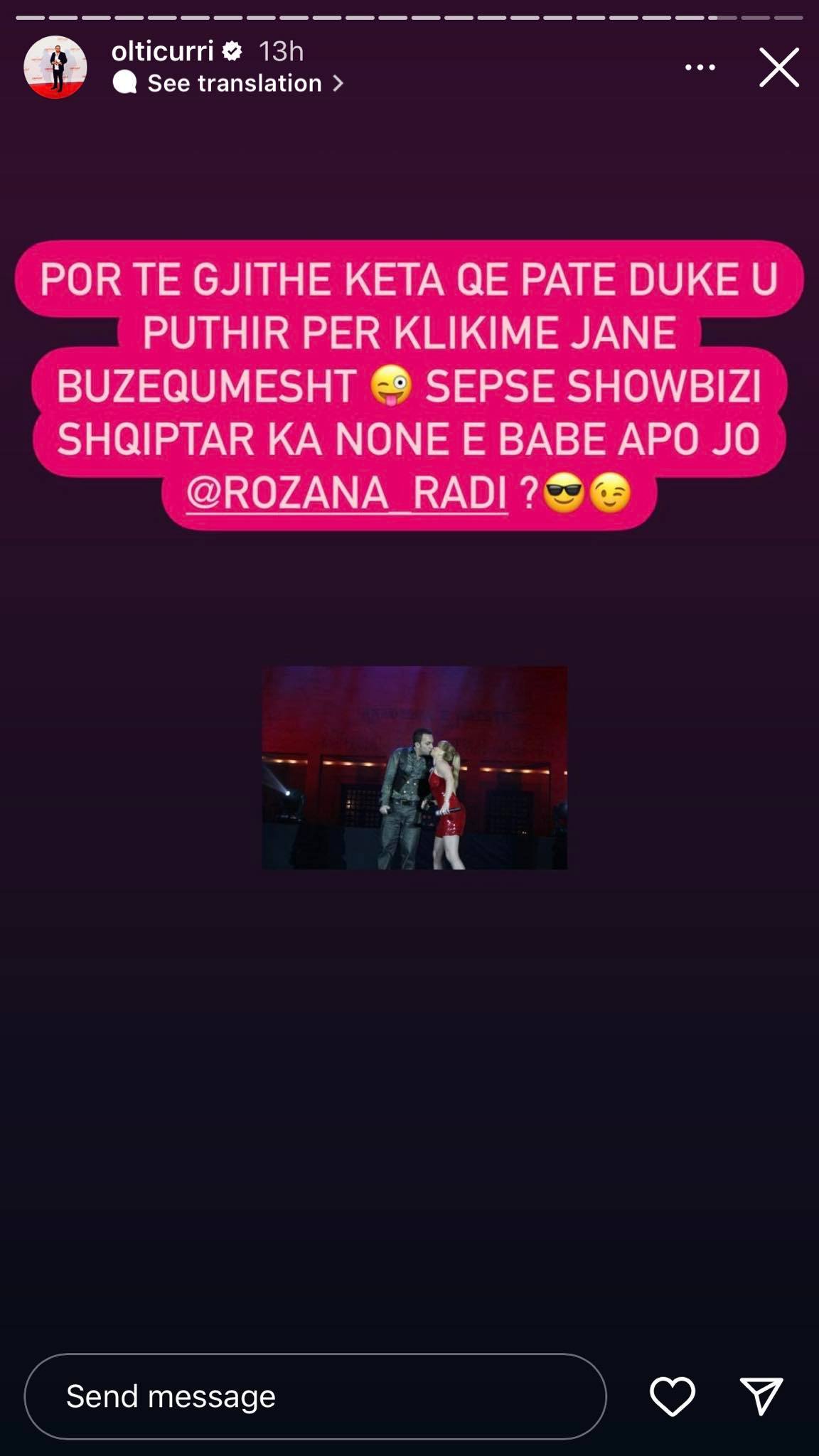 Olti ka publikuar një foto të tij me Rozana Radin, ku vite më parë janë puthur në buzë dhe shkruan:  “Por të gjithë këta që patë duke u puthur për klikime janë buzëqumësht, sepse showbizi shqiptar ka nënë e babë apo jo Rozana Radi?”