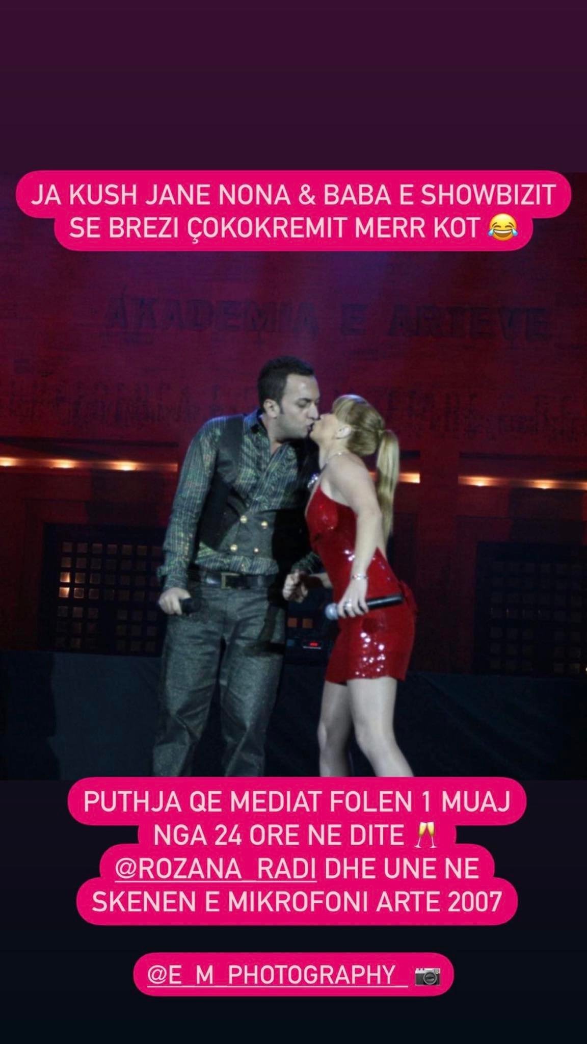 “Ja kush janë nona dhe baba e showbizit se brezi çokokremit merr kot. Puthja që mediat folën 1 muaj nga 24 orë në ditë @rozanaradi dhe unë në skenën e “Mikrofoni Artë 2007”.