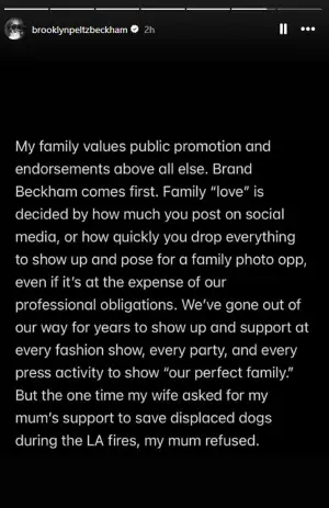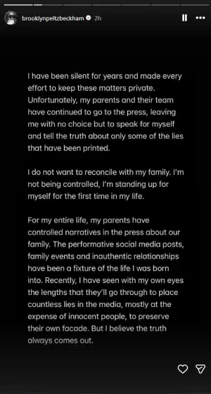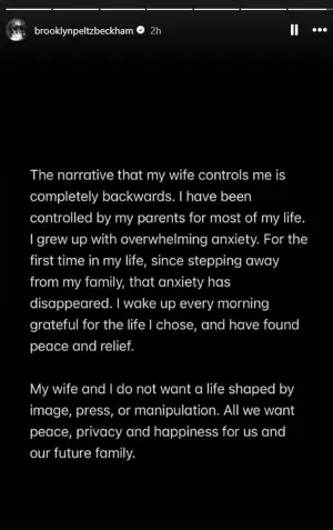 Në fund, Brooklyn kundërshton kategorikisht narrativën e përhapur se Nicola Peltz e kontrollon jetën e tij, duke e cilësuar këtë pretendim si të pavërtetë dhe duke theksuar se, sipas tij, prindërit kanë qenë ata që janë përpjekur ta manipulojnë.