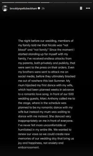 Një nga momentet më të ndjeshme që Brooklyn përmend lidhet me ditën e dasmës, ku ai tregon se vallëzimi i parë me bashkëshorten e tij u prish nga ndërhyrja e nënës së tij, gjë që e bëri të ndihej i parehatshëm dhe i poshtëruar përpara të ftuarve.