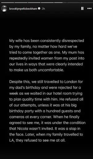 Sipas Brooklyn, prindërit e tij kanë tentuar prej vitesh të kontrollojnë narrativën e jetës së tij dhe janë përpjekur vazhdimisht të dëmtojnë martesën e tij me Nicola Peltz. Ai pohon se është i distancuar nga familja prej rreth tre vitesh dhe se ka zgjedhur të heshtë për një kohë të gjatë për të ruajtur privatësinë, por kjo heshtje, sipas tij, është përdorur kundër tij nga familja dhe ekipi i tyre përmes mediave.