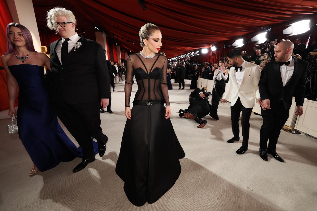 Gaga mahniti me një fustan të zi me një bluzë të tejdukshme korse dhe një fund të plotë. Ajo e shoqëroi veshjen me bizhuteri të Tiffany & Co, duke përfshirë një gjerdan me diamant, një byzylyk dhe një palë vathë të thjeshtë diamanti.