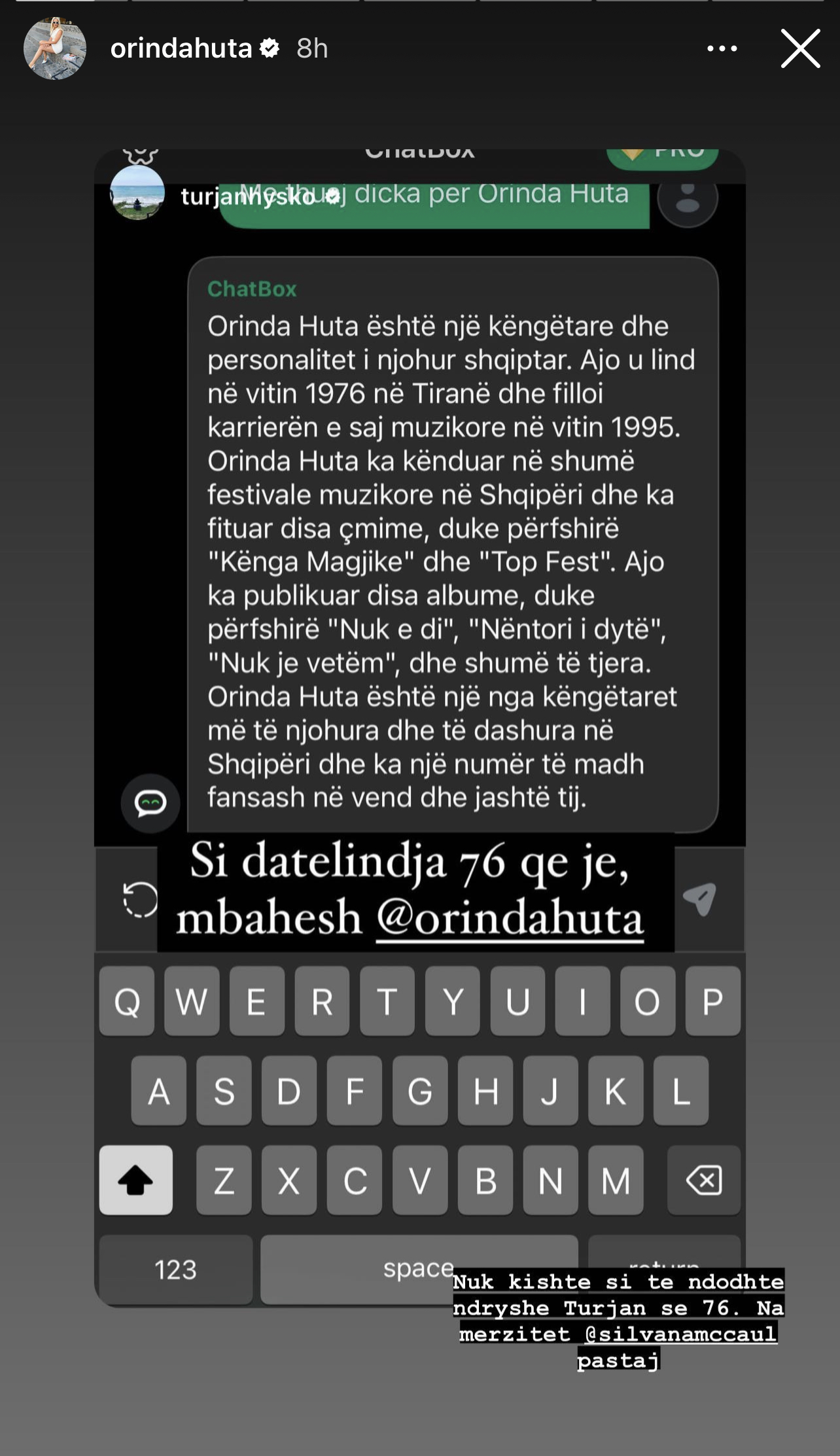 “Si datëlindja 76 që je, mbahesh”– shkruan Turi me humor në ‘instastory”, e sigurisht tag i bëri partneres.