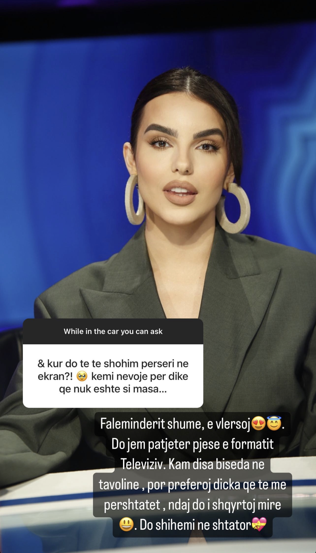 ”Do jem patjeter pjese e formatit televiziv. Kam disa biseda ne tavoline , por preferoj dicka qe te me pershtatet , ndaj do i shqyrtoj mire. Do shihemi ne shtator”- shkruan ajo.