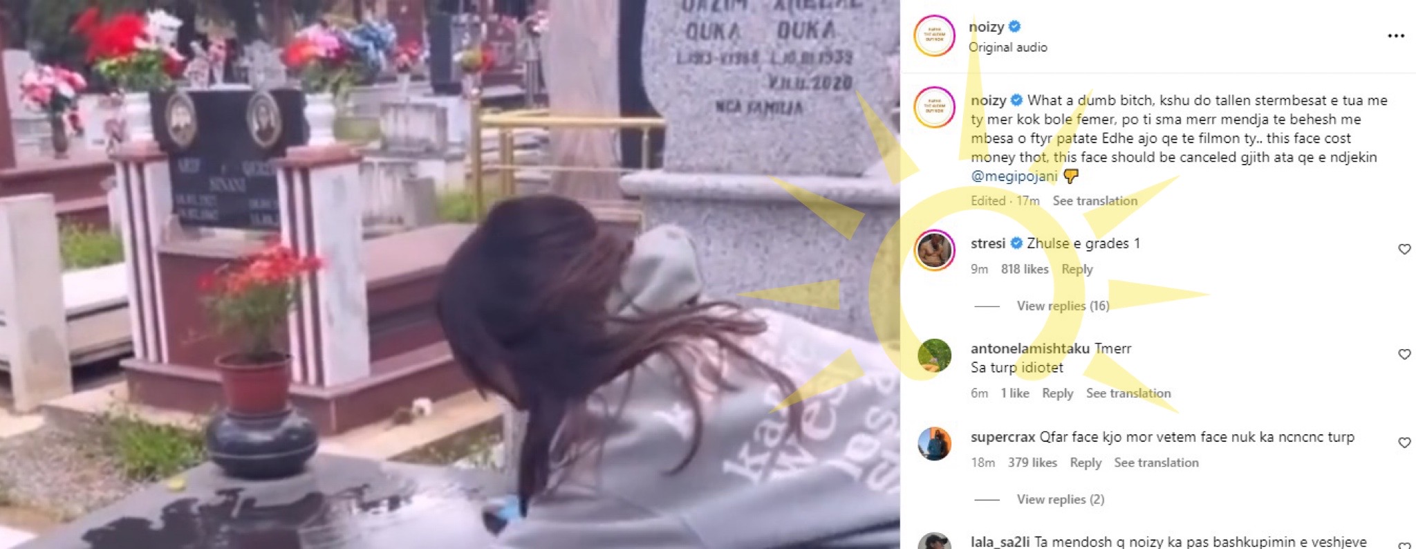 Video skandaloze e Megi Pojanit në varreza duke u tallur ka ngjallur shumë reagime në rrjet. Një prej tyre ishte dhe reperi Noizy, e më pas Stresi. Noizy ka ndarë videon e Megit në profilin e tij në Instagram, duke e kundërshtuar drastikisht veprimin e saj, e madje thotë se ajo duhet të mos ndiqet më nga njerëzit.