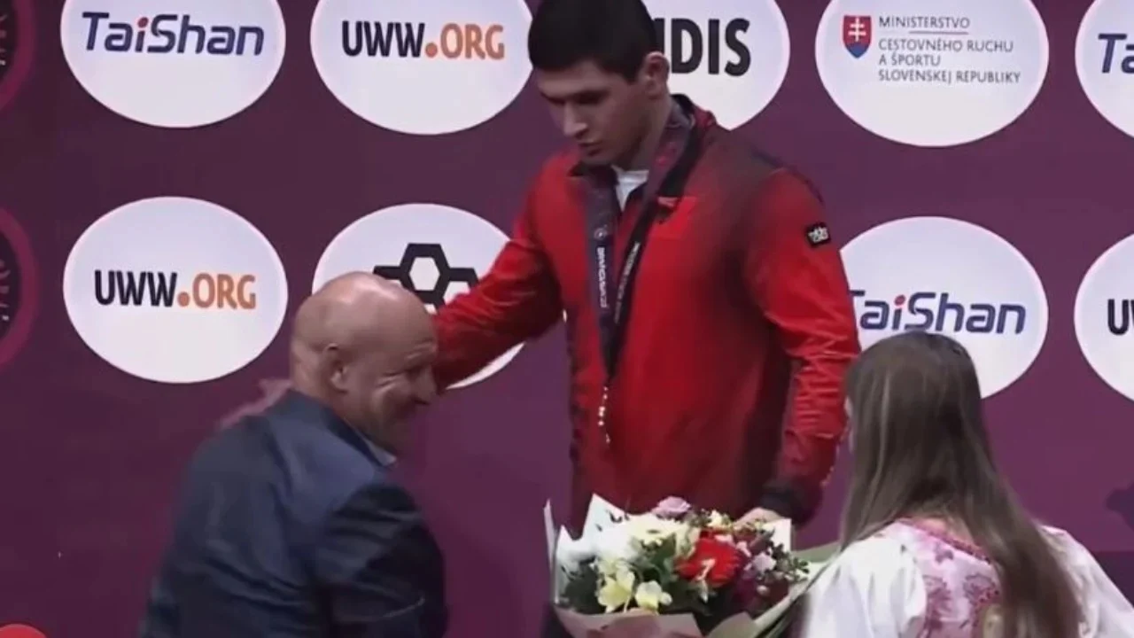 Në ceremoninë e dorëzimit të medaljes së artë të Çermen Valiev që u shpall kampion Europe në mundje me flamurin shqiptar, ndodhi një skandal.