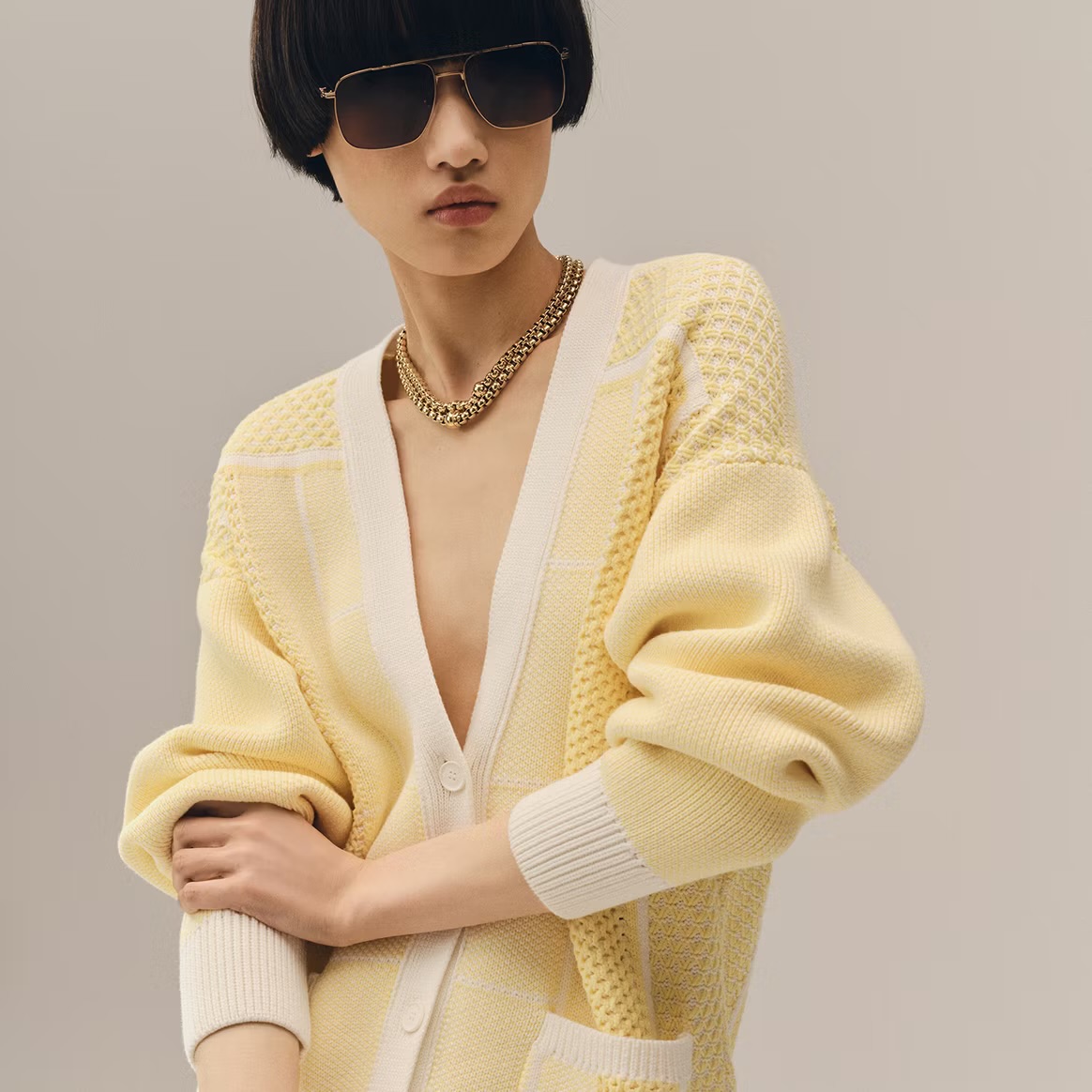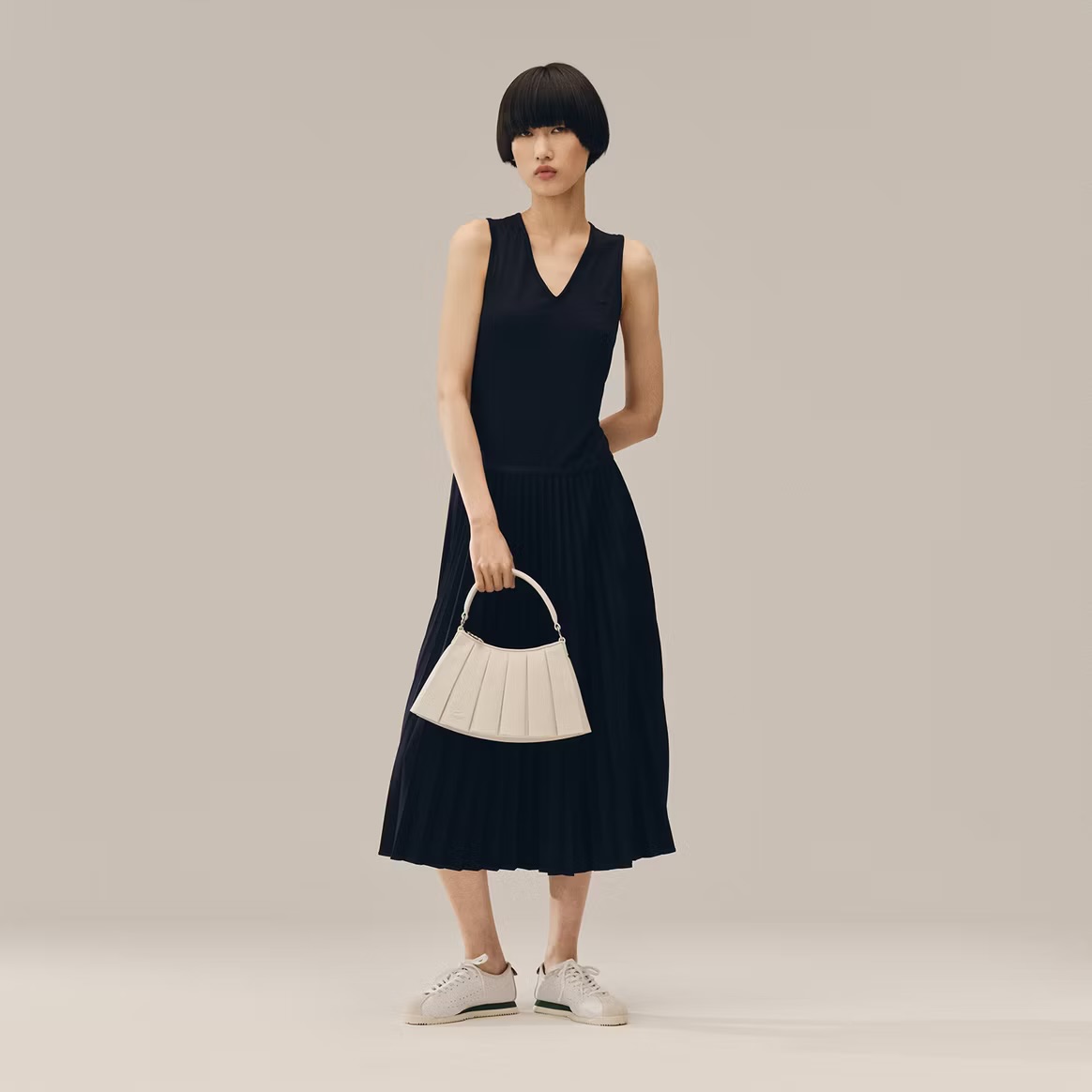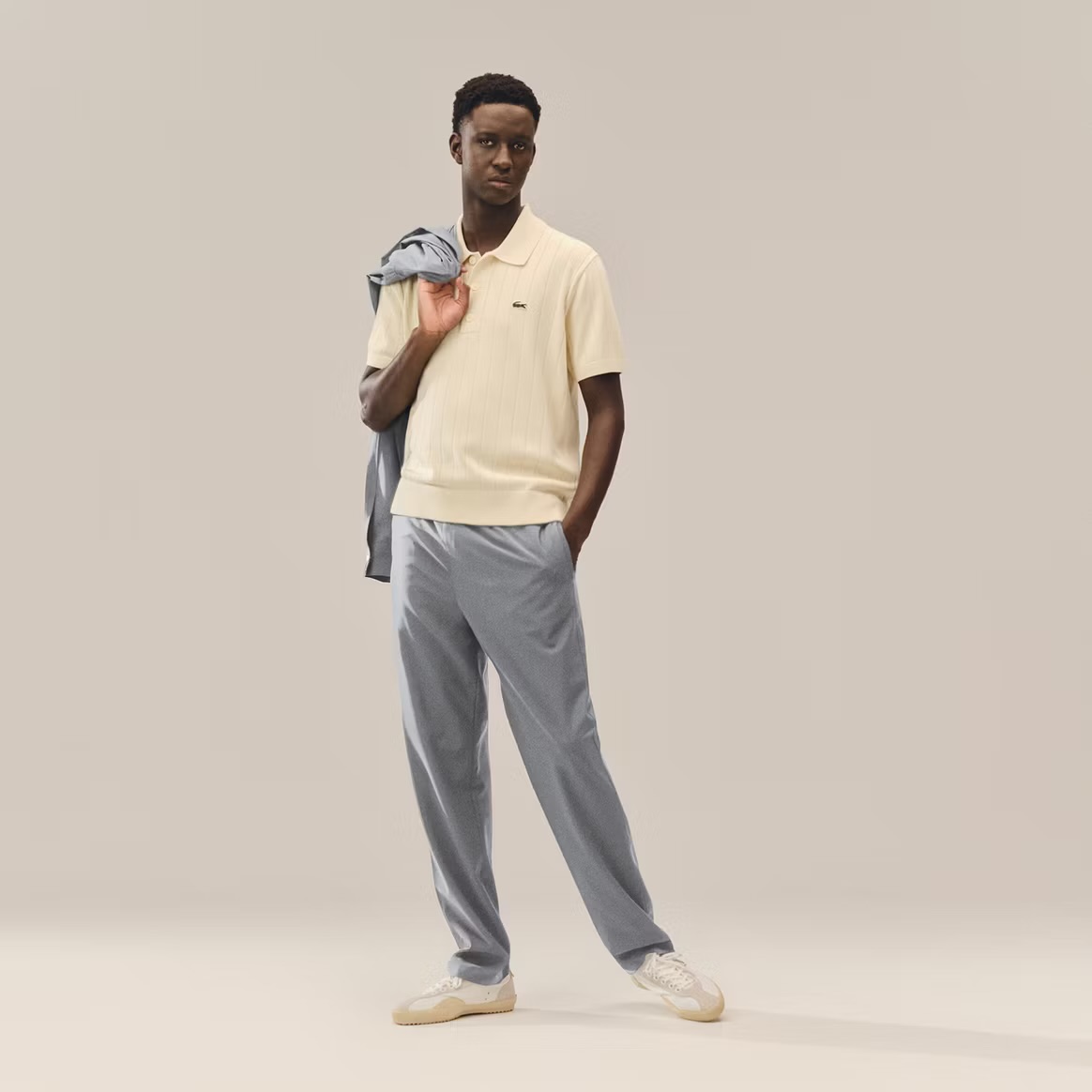 Ikonat e markës rikthehen të riinterpretuara: polo-t bëhen më të gjera dhe gjysmë transparente, ndërsa siluetat e relaksuara kombinohen me materiale si leshi tropikal dhe mohair i butë. Çantat dhe detajet ruajnë trashëgiminë sportive, ndërsa logoja e krokodilit ridizajnohet në mënyrë më të rafinuar.