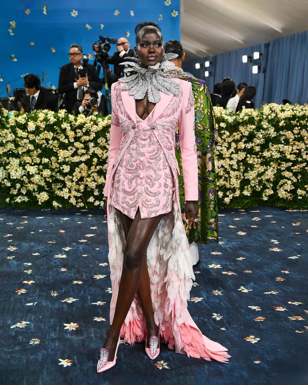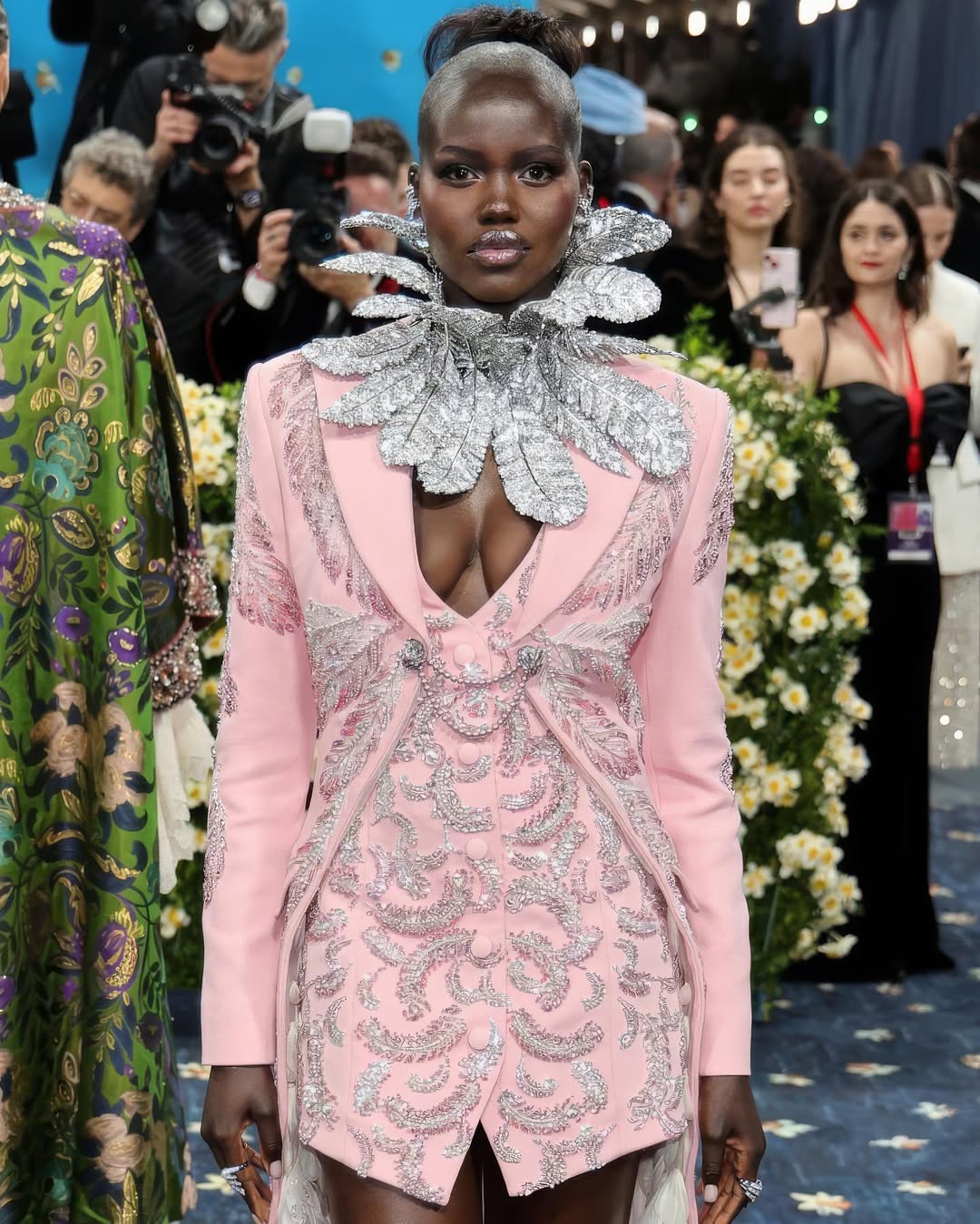 Këngëtarja FKA Twigs u shfaq me një fustan të stilit të viteve 1920, të dizajnuar nga Wales Bonner dhe të zbukuruar me mijëra kristale Swarovski, duke sjellë një ndjesi të elegancës së epokës së artë.