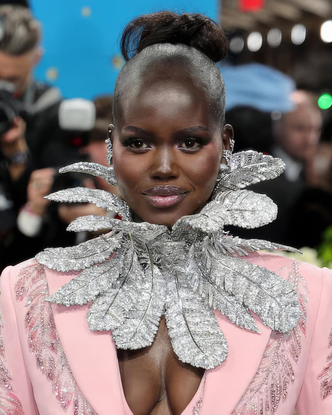 Modelja Adut Akech u shfaq me një fustan të shkurtër të frymëzuar nga një miksim i një xhakete dhe një pallto të gjatë, e zbukuruar me mbi 25,000 kristale Swarovski në formë puplash. Aksesorët përfshinin një jakë të veçantë dhe vathë të koleksionit të ri “Vienna”, duke krijuar një pamje të sofistikuar dhe të fuqishme.