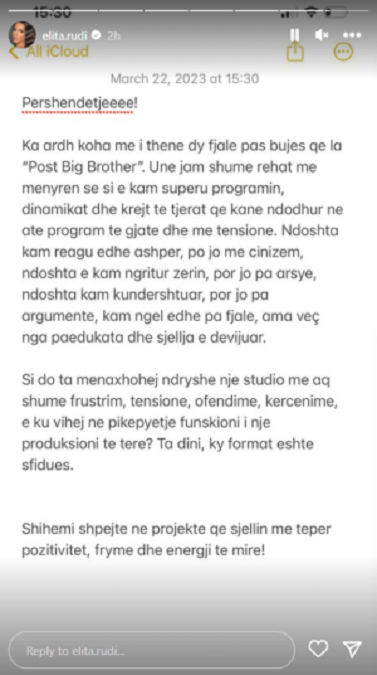 “Përshëndetje, ka ardhur koha me i thënë dy fjalë pas bujës që la “Post Big Brother”. Unë jam shumë rehat me mënyrën sesi e ka superuar programin, dinamikat dhe gjithë të tjerat që kanë ndodhur në atë program të gjatë dhe me tension. Ndoshta kam reaguar edhe ashpër, por jo me cinizëm, ndoshta e kam ngritur zërin, por jo pa arsye, ndoshta kam kundërshtuar, por jo pa argument, kam ngel edhe pa fjalë, ama veç nga paedukata dhe sjellja e devijuar. Si do ta menaxhoja ndryshe një studio me shumë frustrim, tensione, ofendime, kërcënime, ku vihej në pikëpyetje funksioni i një produksioni të tërë? Ta dini, ky format është sfidues. Shihemi shpejtë në projekte që sjellin më tepër pozitivitet, frymë dhe energji të mirë.”