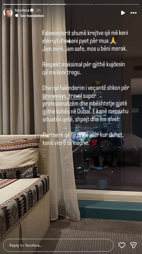 “Faleminderit shumë krejtve që më keni shkrujt dhe keni pyet për mua. Jam mirë, jam safe, mos u bëni merak. Respekt maksimal për gjithë kujdesin që ma keni tregu”, ka shkruar Fero në InstaStory.