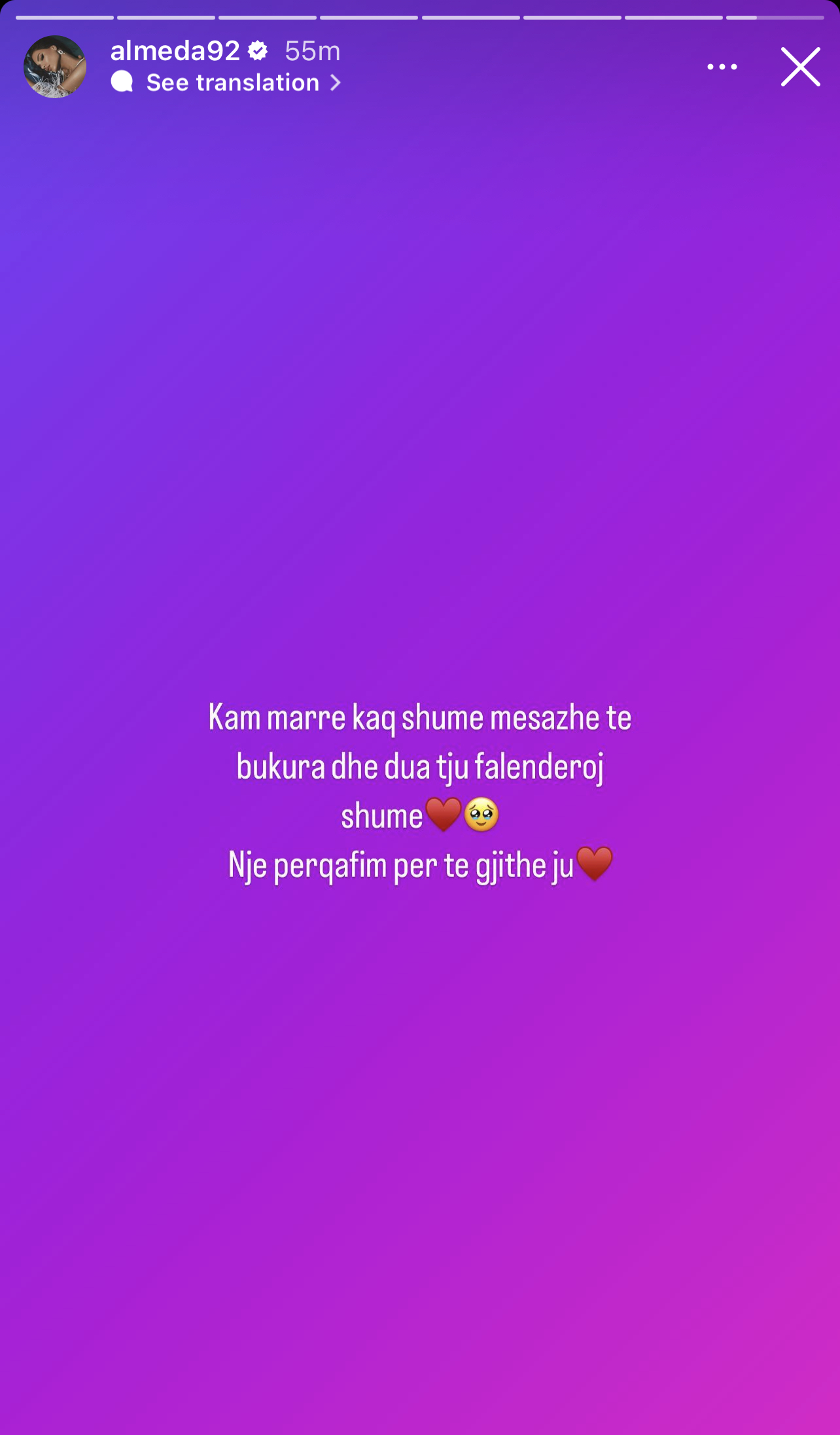 ”Kam marrë kaq shumë mesazhe të bukura. Dua t’ju falenderoj. Një përqafim për të gjithë ju”- shkruan Almeda.