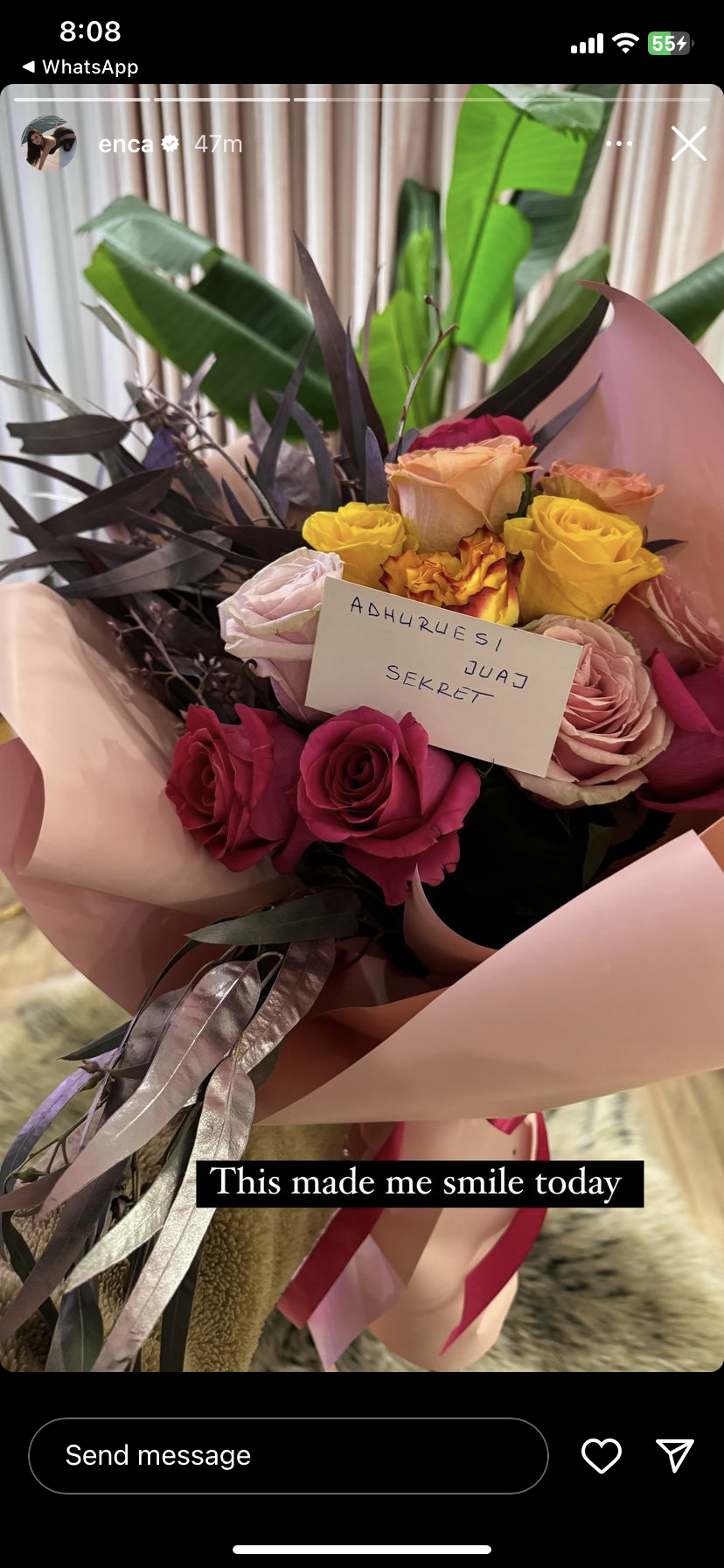 E në një tjetër story publikon një buqetë me lule prej një fansi të saj ‘sekret’. Por ku ndodhet i dashuri i saj? Mos ndoshta Enca po kalon krizë në marrëdhënien e saj?