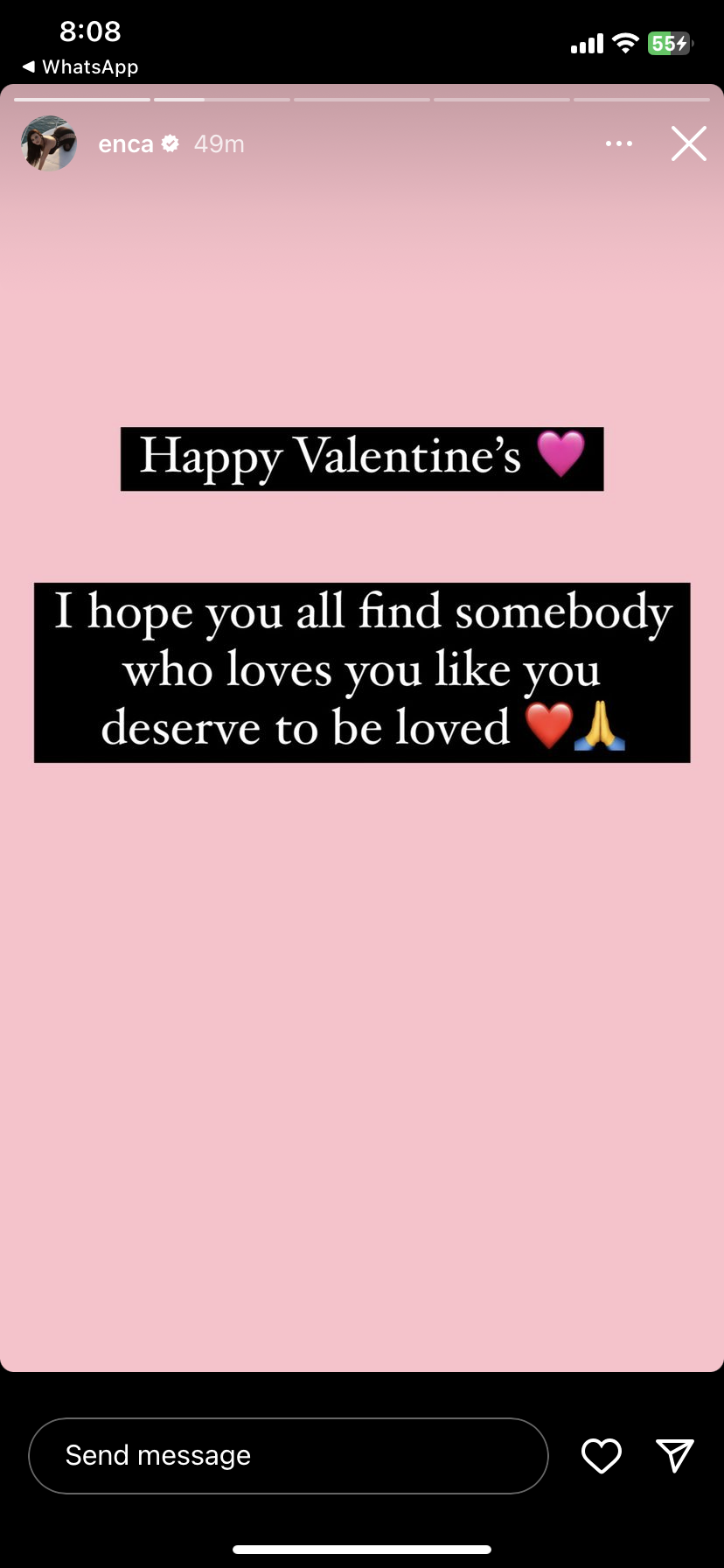 Një ndër to është dhe Enca, e cila nëpërmjet një ‘Instastory’ shkruan: Uroj të gjeni dikë që ju do ashtu sikurse e meritoni të duheni!