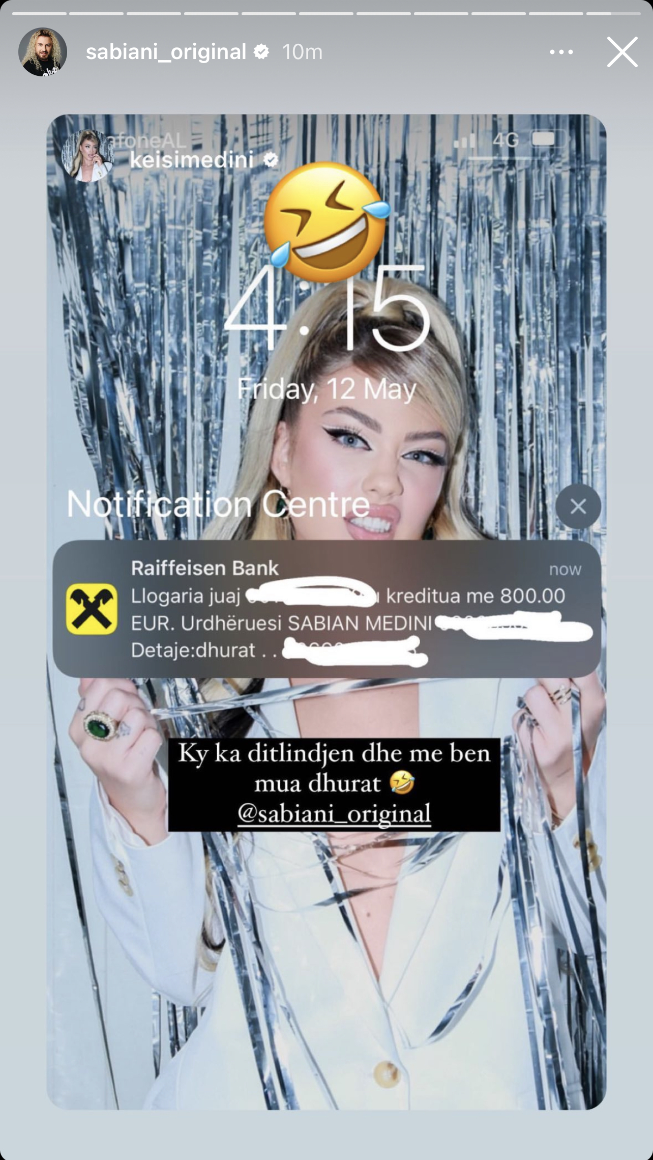 Keisi ka postuar një foto ku shihet se Sabiani i ka transferuar disa para.