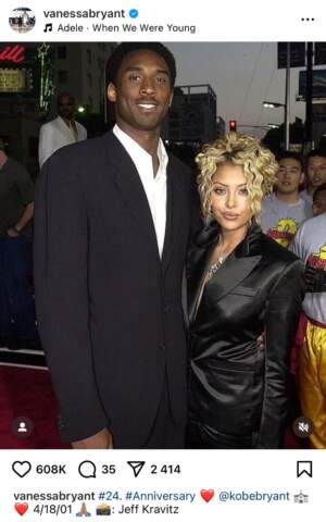 Më 18 prill 2025, Vanessa Bryant nderoi përvjetorin e 24-të të martesës me bashkëshortin e saj të ndjerë, Kobe Bryant, me një postim prekës në Instagram. Ajo ndau një foto të çiftit nga premiera e filmit “Rush Hour 2” në korrik 2001, duke e shoqëruar me mbishkrimin: “#24. #Anniversary ❤️ @kobebryant ⛪️❤️ 4/18/01 🙏🏽”, duke iu referuar numrit të fanellës së Kobe-t me Los Angeles Lakers.