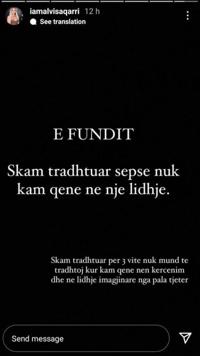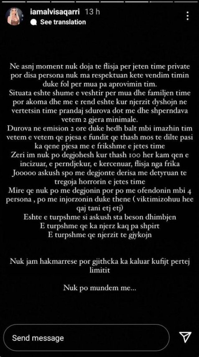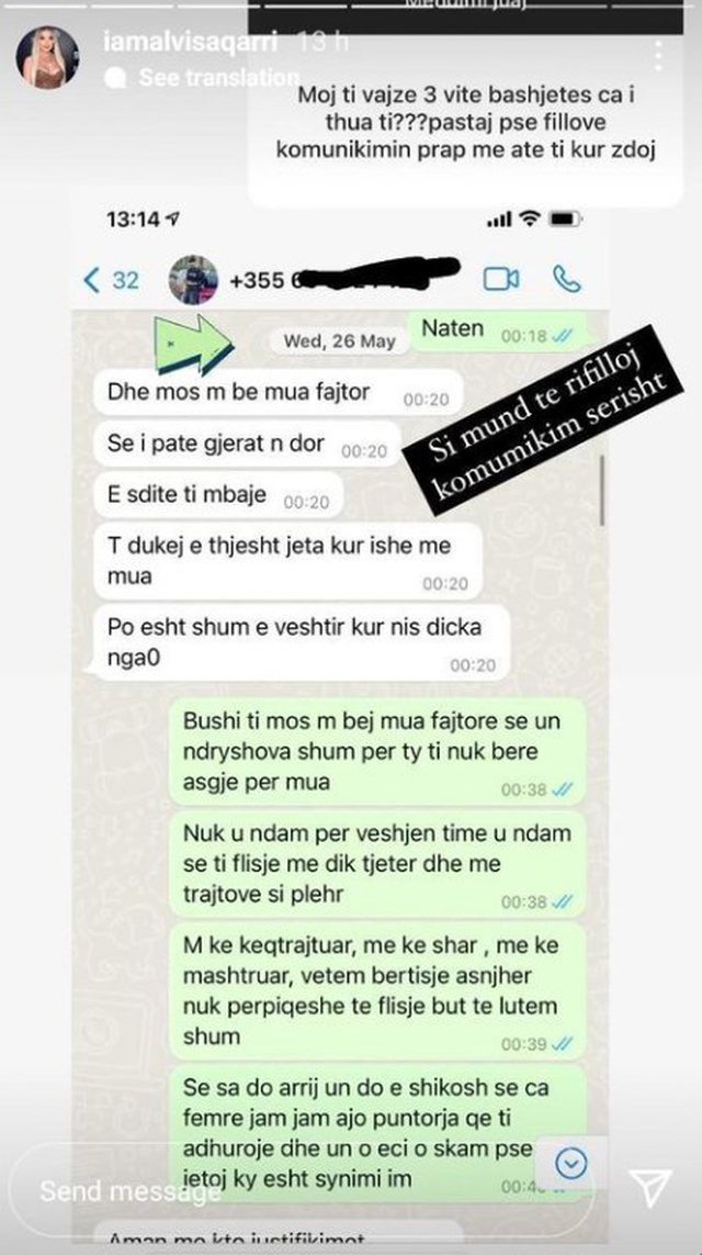 Familja e tij e di shumë mirë se çfarë personi është ai. Ka ushtruar dhunë tek familja e tij, te motrat e tij, te mbesa e tij dhe jo më tek unë që nuk më ka asgjë. Kështu që do t’i them një thirrje të fundit familjes së tij: Nëse ai vazhdon me këtë muhabet, unë do vazhdoj me organet kompetente. Deri tani nuk e kam bërë, kur kemi qenë të lidhur sepse e kam dashur, këto kohë nuk e kam bërë sepse kam menduar se do ta zgjidhim si njerëz të rritur që jemi, por tani është lajmërimi im i fundit. Nëse ai hedh dhe gjënë më të vogël dhe bën gjestin më të vogël unë do shkoj dhe do ta denoncoj se nuk e lë më këtu.