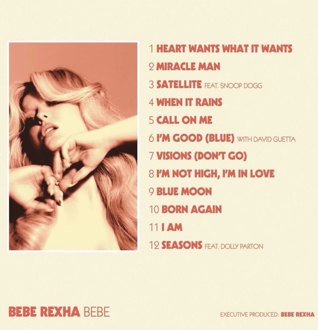 Këngëtarja shqiptare me famë botërore, Bebe Rexha, ka publikuar ditë më parë albumin e saj të tretë në karrierë “Bebe”. Ky album përmban 12 këngë, tre prej të cilave janë bashkëpunime me emra të njohur të muzikës ndërkombëtare si: David Guetta, Snoop Dogg dhe Dolly Parton.