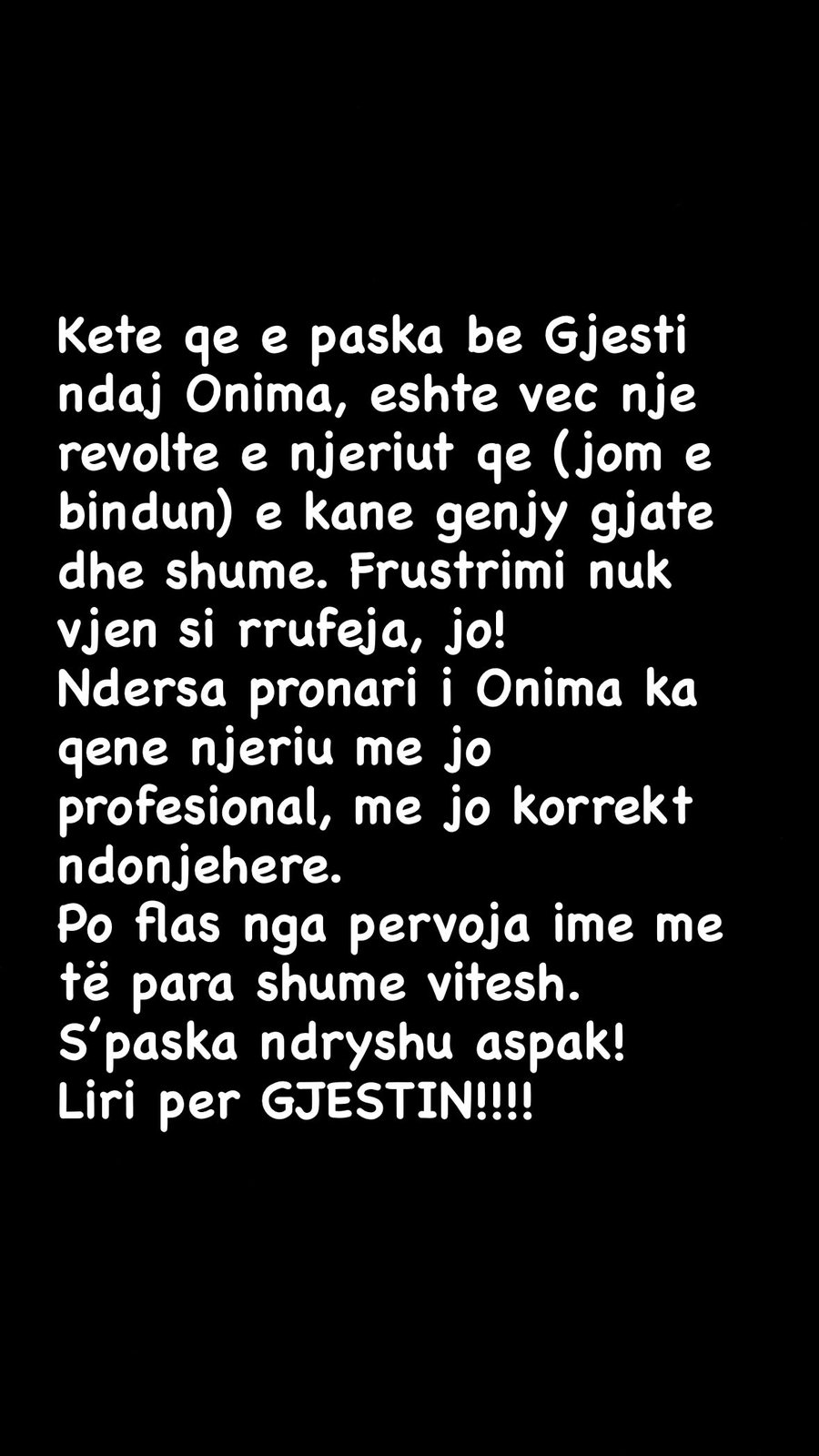 Këngëtarja Zanfina Ismaili ka reaguar publikisht pas ngjarjes që përfshiu Gjestin dhe pronarin e kompanisë Onima. Përmes një postimi në rrjetet sociale, ajo është rreshtuar hapur në krah të artistit, duke lënë të kuptohet se sjellja e tij ka ardhur si pasojë e një zhgënjimi të akumuluar prej kohësh.
